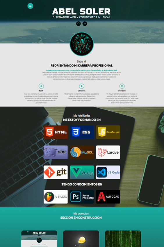 Afición a la composición musical, a largo plazo, me gustaría combinarlo con la programación, sería ideal participar en proyectos donde poder musicalizar aplicaciones web.